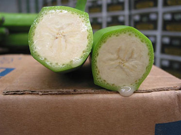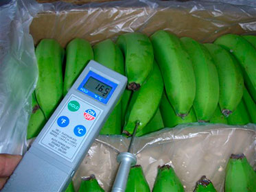 La sequenza di immagini qui sotto mostra una perizia effettuata allo sbarco su un carico di banane. I ns. tecnici verificano le condizioni del carico, lo stato dei frutti e ne misurano la temperatura e le caratteristiche complessive. In questo caso specifico, la banana, che deve essere di un colore verde brillante uniforme e va conservata a una temperatura di 13/13,2°C, presenta diverse difformità.